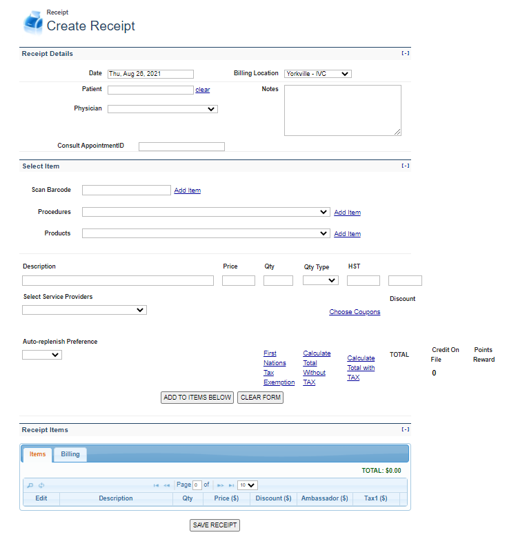 In this section, the user will select the relevant Barcodes, Procedures and Products to add to the Receipt. These items can be added to the receipt one at a time.