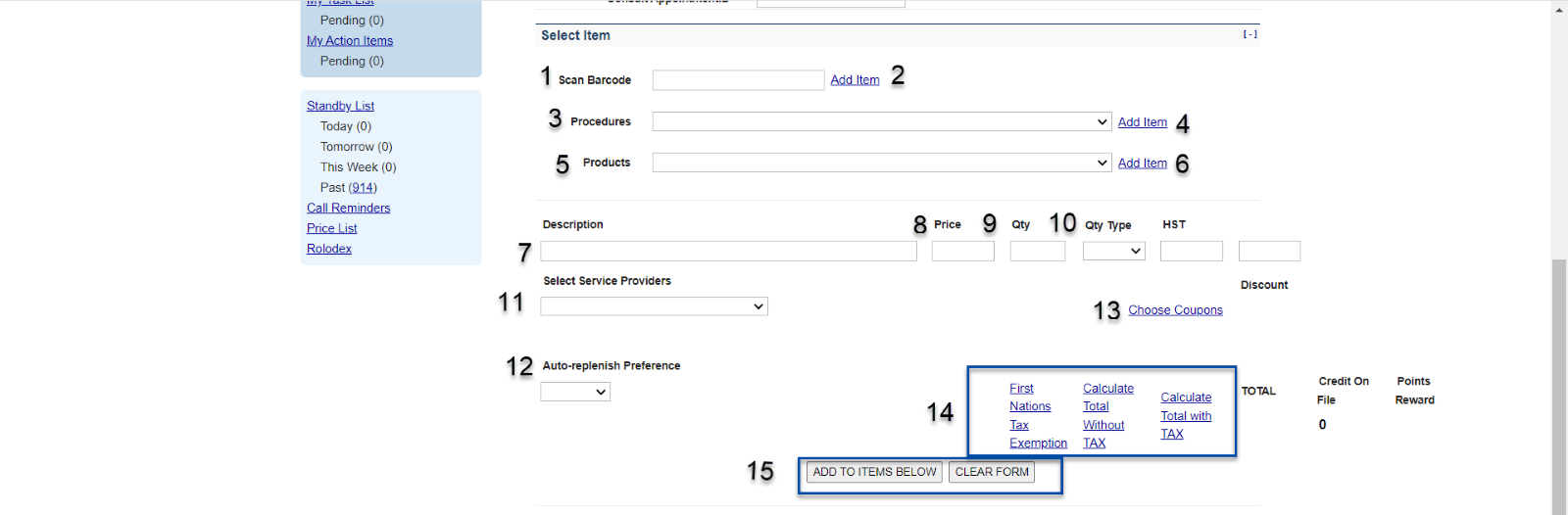 After verifying the Item and Totals, the user must click (15) to either Add To Items Below, which adds the item to Credit Memo Items or Clear Form, which resets the selection form.