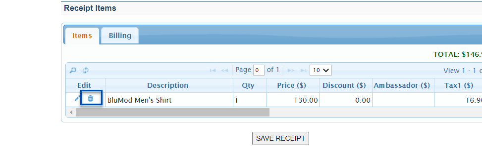Once added, items will appear in the Receipt Items list. To remove an item, click the corresponding Delete icon. To create the final Invoice, click Save Receipt. The Receipt will be displayed for printing.