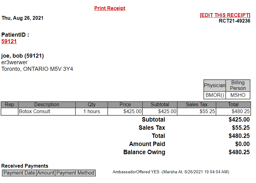 Once the information is entered, the Receipt Details will look like: