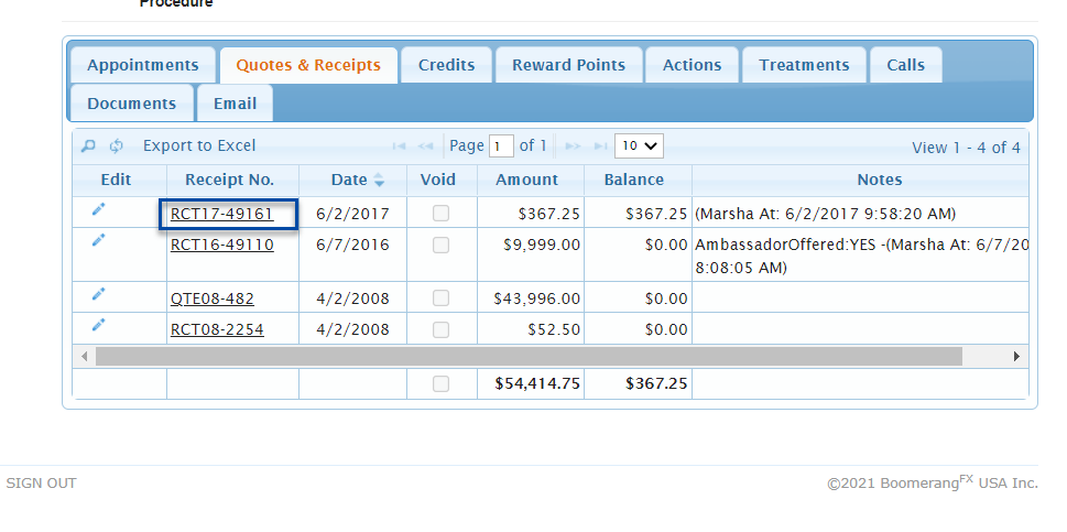 At the bottom of the screen, click the Quotes & Receipts tab to view all Receipts. Click on the Receipt Number to view the Receipt in full.