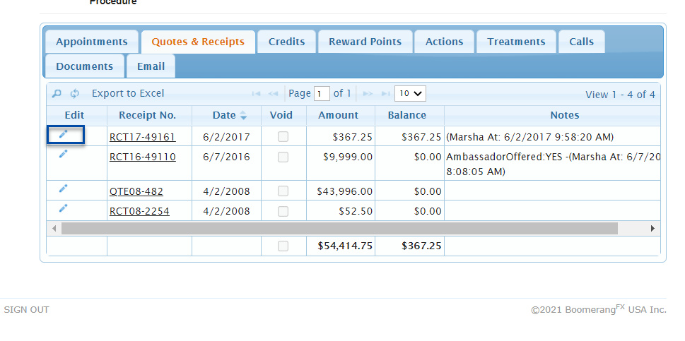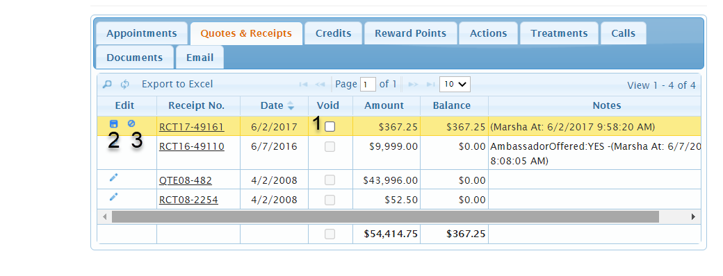 To Void a Receipt, click on the Edit icon for the corresponding Receipt.