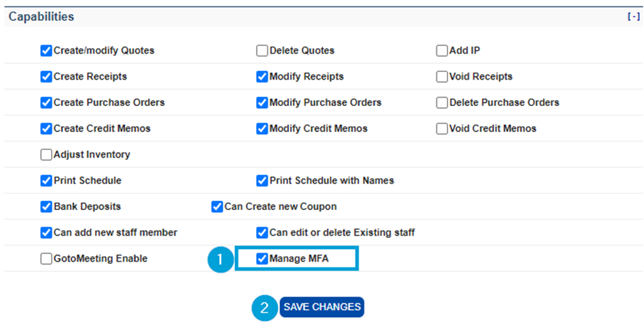 In the Edit screen, scroll down to the Capabilities section, add a check to the Manage MFA option (1), and press Save Changes (2).