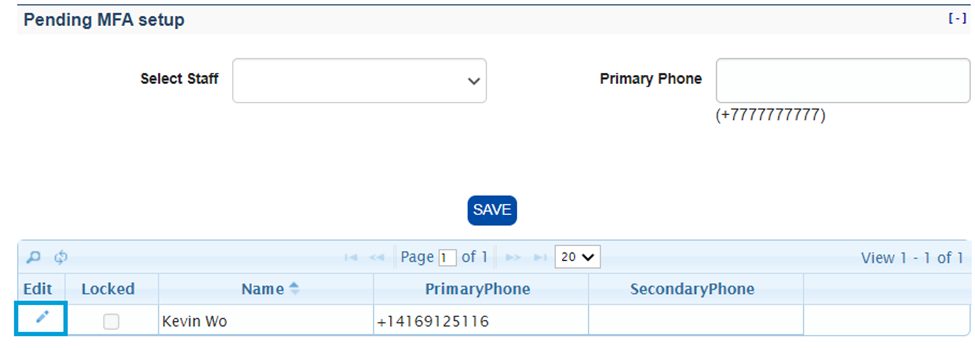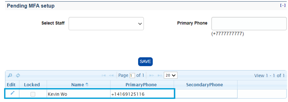 The user will now appear in the MFA list with a Primary Phone number.