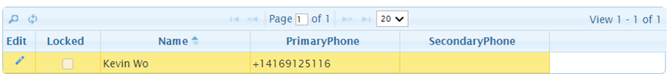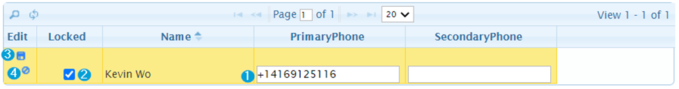 You can now edit the Primary Phone number (1) or unlock the user by unchecking the Locked checkbox (2). To save your changes, press the Save icon (3). To cancel changes, press the Cancel icon (4).