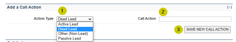 - Update the Call Action Type to one of four types: Active Lead, Dead Lead, Other (Non-Lead) or Passive Lead