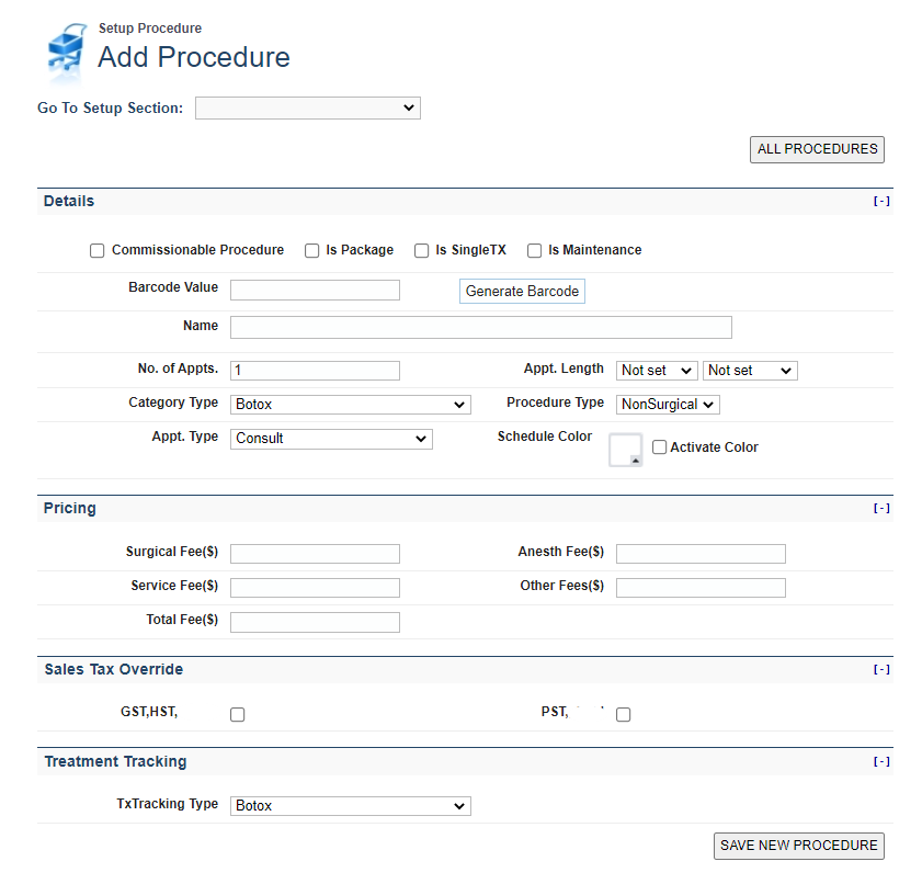 In the Add Procedure screen, there are four sections to be completed before saving.